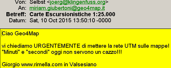 Urs Grütter, Gümligen BE, 3. November 2015: "Besten Dank für Ihre wertvollen Bemühungen und Zusammenstellungen - gute Italienkarten sind gar nicht so einfach zu finden!"