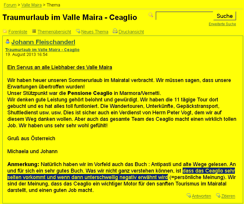 Die Bibel der GTA-Weitwanderer ist letztendlich schuld daran, dass auch Jörg Klingenfuß vor Jahrzehnten im nördlichsten Piemont hängengeblieben ist und seit 2002 zusammen mit lokalen Initiativen im Sommer Bergwanderungen in Rimella und seit 2004 auch im Sesiatal sowie individuelle Begleitungen organisiert hat.