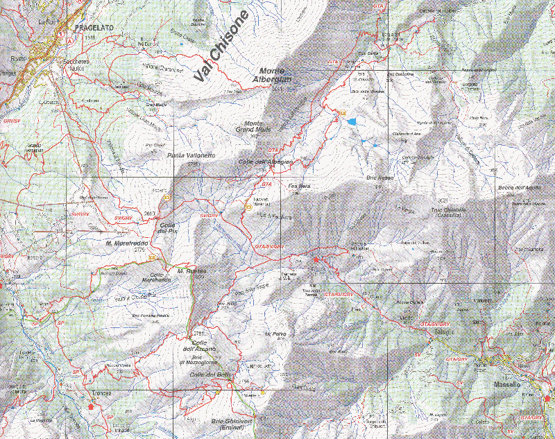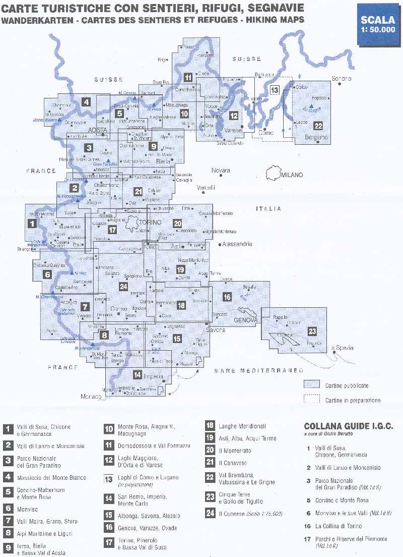 Exzellente und topaktuelle Wanderkarten im großen Maßstab 1:25000 gibt es für einige ausgewählte Gebiete im Piemont und in Ligurien. Für GTA-Weitwanderer sind sie wegen dem großen Maßstab nur bedingt geeignet: für zwei Wochen GTA müßte man manchmal 4-5 Wanderkarten mitschleifen statt maximal 1-2 Blätter. Für Detail-Interessierte oder für einen ein- oder zweiwöchigen stationären Urlaub in einem bestimmten Gebiet sind sie jedoch ideal. Erhältliche Blätter im Bereich der GTA, klares Kartenbild mit guter Reliefdarstellung und UTM-Gitter für GPS: