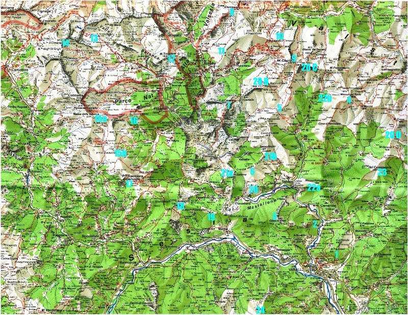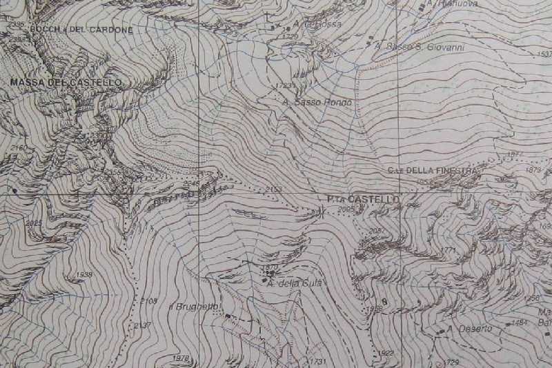 Carta Topografica d'Italia 1:25000, Istituto Geografico Militare. Präzise Karte, die jedoch nur durch ausgewiesene Wildnisspezialisten wie uns korrekt interpretiert werden kann. Die gelegentliche Berücksichtigung dieser traditionellen italienischen Militärkarte durch wirklich Ortskundige ist nur sinnvoll in intelligenter Kombination mit anderen perfekt evaluierten Quellen, insbesondere für unsere zukünftigen Projekte im Wildnisgebiet Rimella und Mastallonetal. Touristisch ist die Karte völlig unbrauchbar! Positiv: Sehr gutes topographisches Relief, gute Felsdarstellung, UTM-Gitternetz für GPS. Negativ: viele Ortsnamen sind grottenfalsch; Kosten mit Bankgebühren und Porto total weit über 20 EUR pro Sektion und somit extrem teuer; Lieferzeiten bestenfalls ½ bis 1 Jahr; praktisch sämtliche verlassenen Alpen wurden gelöscht und mit ihnen sämtliche auch noch vorhandenen Wege. Beispielsweise fehlt im obigen Ausschnitt aus dem Blatt 72 Sektion 3 Balmuccia in der Bildmitte der zentrale Übergang von der Alpe Cardone (Name fehlt) über den Sella Bassa dla Cuvàa (Name fehlt) zur Alpe Cuvàa (Name falsch), während ein völlig zugewachsener und unmöglicher Übergang westlich der Punta Castello eingezeichnet ist! Zwanzig Jahre nach dieser unserer realistischen Bewertung ist die im CAI/TCI-Gebietsführer identisch: "Anche se i rilievi risalgono agli anni '30, la rappresentazione del terreno è generalmente ancora attuale, mentre mancano diversi toponimi e altri sono errati. Parecchi alpeggi sono ridotti a ruderi e molti sentieri sono scomparsi. Evidentemente la rete stradale è assolutamente superata e anche le carte più recenti sono carenti e non sono state apportate le necessarie correzioni."