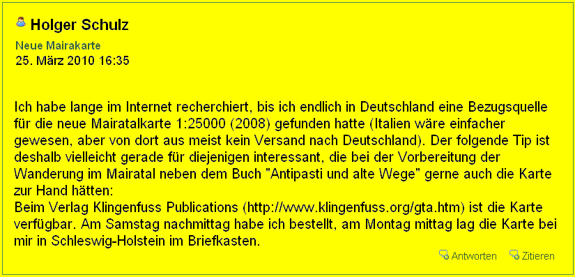 Richard Schulze, 28. Mai 2012: "Im Internet habe ich gelesen, dass Sie die neueste Auflage der Mairakarte haben. In Großbuchhandlungen kann man leider nur noch die alten Auflagen von 2006 auffinden."