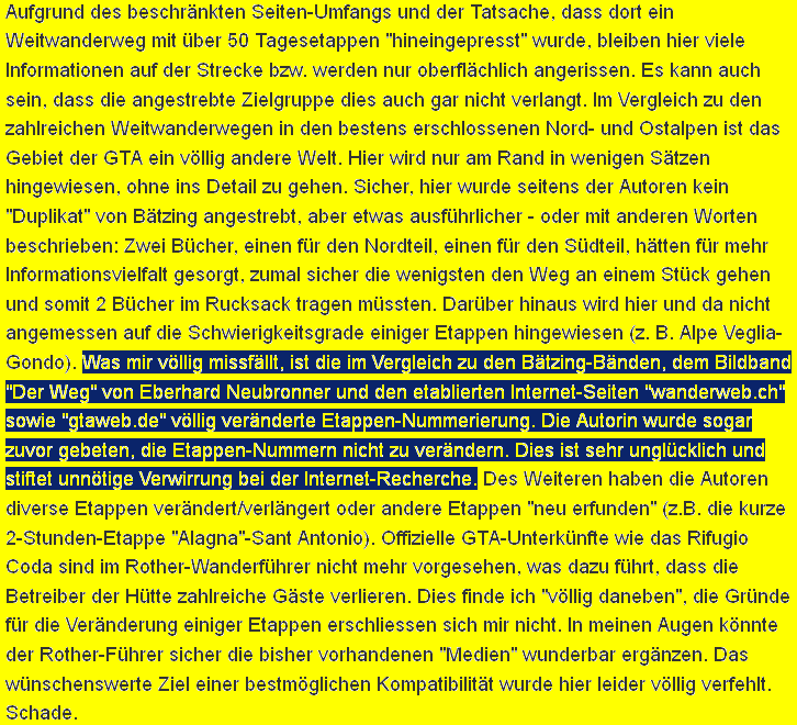 Als Spezialisten für dieses Gebiet erlauben wir uns folgende Ergänzungen zum Rother-Wanderführer: Obwohl wir die Autoren rechtzeitig davor gewarnt haben, verwendet der Rother-Führer leider andere Etappennummern als Bätzing und Neubronner und die GTA-Webseite, was seit 2012 zu zahlreichen Verwechslungen füht, für die wir jede Verantwortung ablehnen. - Seite 73 und 74, Wegpunkt 4 heißt Alpe Selletta, nicht Alpe Selle (die liegt zwei Etappen weiter oberhalb des Lago di Baranca). - Seite 74, der Ortsteil auf dem Abstieg von Villa superiore nach Chiesa heißt Prati, nicht Villa inferiore. - Seite 74, der höchstgelegene Ortsteil ist San Giorgio 1446 Meter, nicht Villa superiore. - Seite 78, Ristorante Lo Scoiattolo ist geschlossen.
