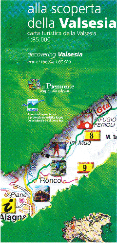 Alla Scoperta della Valsesia - Carta Turistica della Valsesia 1:85000. Agenzia di Accoglienza e Promozione Turistica Locale della Valsesia e del Vercellese (Corso Roma 38, I-13019 Varallo, Telefon 0163 564404, Fax 53091). Sehr praktische Übersichtskarte, die jährlich (!) neu erscheint und die kostenlos im Touristenbüro von Varallo abgegeben wird. Die netten Mitarbeiterinnen sind auch sonst sehr hilfreich!