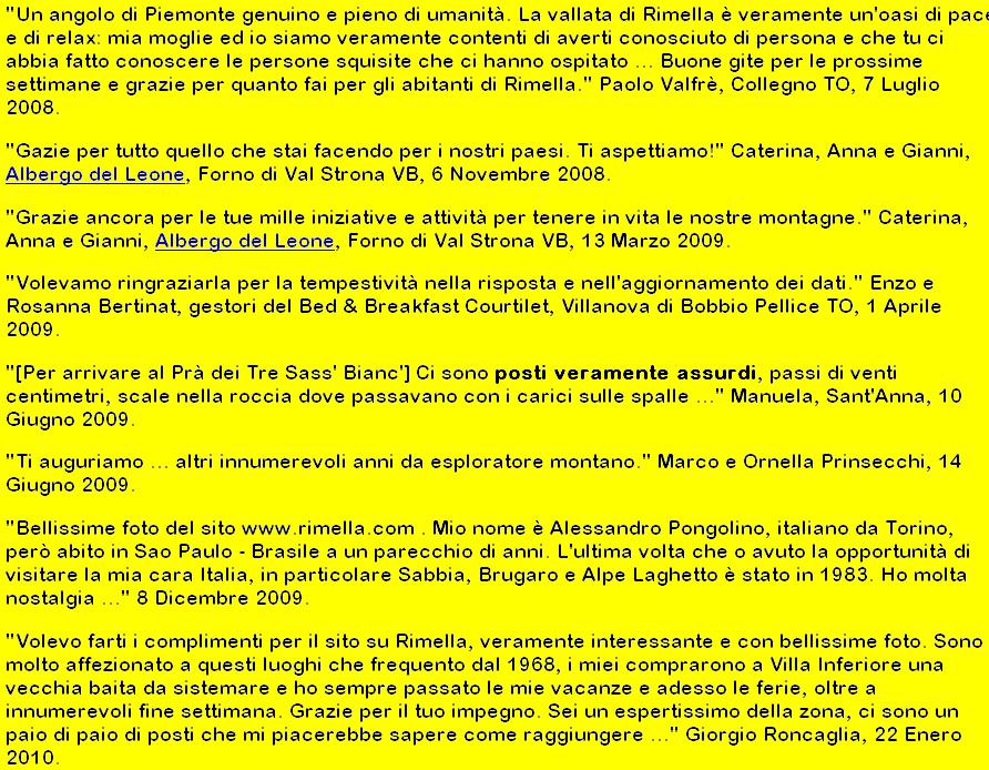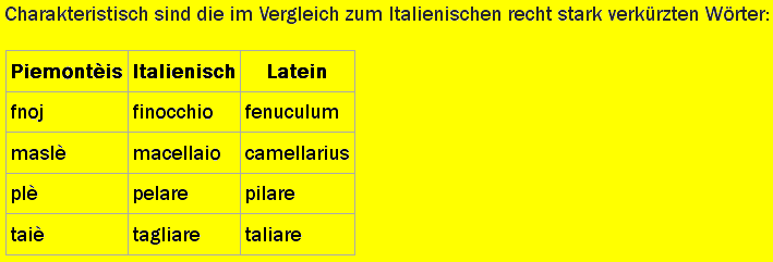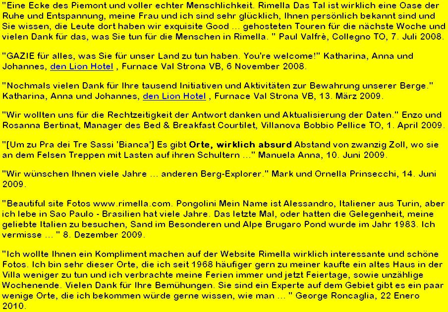 Kaum jemand spricht Deutsch oder Englisch oder gar Französisch - wozu auch! Nur in den Grenzgebieten zu Frankreich spricht man das dortige "Kreol" namens Okzitanisch, und in Walserdörfern wie Rimella sprechen die alten Leute noch das Tüttschu, das dem Dialekt der Walliser Bergbauern aus dem 13. Jahrhundert (!) entstammt und heutzutage selbst für währschafte Innerschweizer nur noch in Ansätzen verständlich ist. Lassen Sie sich durch diese Situationsbeschreibung aber niemals von einer Bergwanderung auf der GTA abhalten: vor Ort gibt es keine Probleme, da Italiener im allgemeinen sehr höflich sind und insbesondere die piemontesischen Bergbewohner sehr freundlich und hilfsbereit, was uns schon viele deutschsprachige Weitwanderer in zahlreichen Zuschriften hier dutzendfach bestätigt haben!