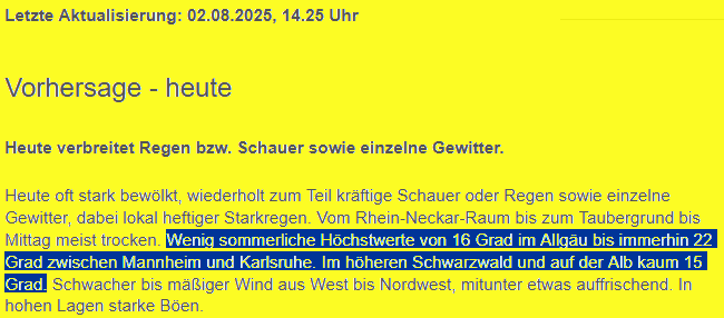 Nach Ostern bis in den Mai hinein Superwetter. Mitte Mai regnerisch, Ende Mai bis Mitte Juni schönes Wanderwetter; bei 26 Grad erste Gewitter. Ende Monat Hitzewelle. Juli Supersommer mit normalen Temperaturen und nur wenige heftige Gewitter. Zuhause in Tübingen dann, seit einem halben Jahr schon wieder, ilachmezdaud, die übliche Panikmache in der dummdeutschen Massenmedienmeinungsmanipulationsmafia, die bereits seit dem Frühjahr auftragsgemäß Angst und Horror und Schrecken verbreitet hat! Focus, 12. Mai: "Ein extremer Sommer steht Deutschland bevor. Die Hitze läßt sich schon jetzt nicht mehr wegdiskutieren und bei Regen sieht es auch schlimm aus ... einen der heißesten Sommer seit Beginn der Wetteraufzeichnungen ..." Ecco, halt wieder das übliche saudumme Geschwätz der populistischen Panikpropheten. Im Gegensatz zu diesen unverschämten Lügen haben wir hier seit dem Juli - mitten im sogenannten "Hochsommer"! - schon wochenlang ununterbrochen gerade mal 18 bis 20 Grad Tageshöchsttemperatur und ewiges Soichwetter bis weit in den August hinein ...