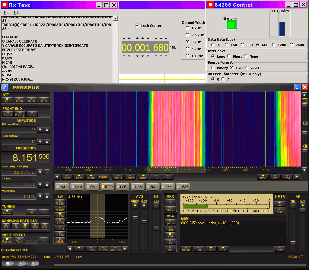Here we zoom on the PSK aggregate signal of station IDR on 8151.5 kHz, and decode STANAG 4285 by means of amateur decoding freeware SIGMIRA. The waterfall display here is 12 kHz wide and shows the complex aggregate and signal propagation fading in full detail. Note also the typical rectangular PSK FFT spectrum in the filter display. Below is the same transmission on 4227.5 kHz decoded with a professional WAVECOM W-CODE system. Click to enlarge!