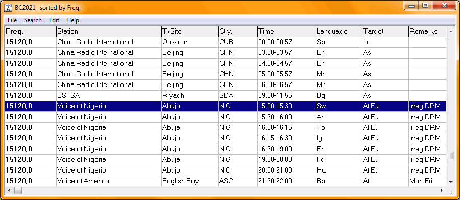 ... it is limited to a total height of 5 scrollable (!) lines only, and to a total width of 82 characters per line, e.g. typically five small columns for Frequency, Time, Country, Station, and Language, and it is more or less incompatible with our detailed frequency lists of professional utility radio stations, i.e. the really interesting stuff as perfectly demonstrated here. What's more, because of these limitations