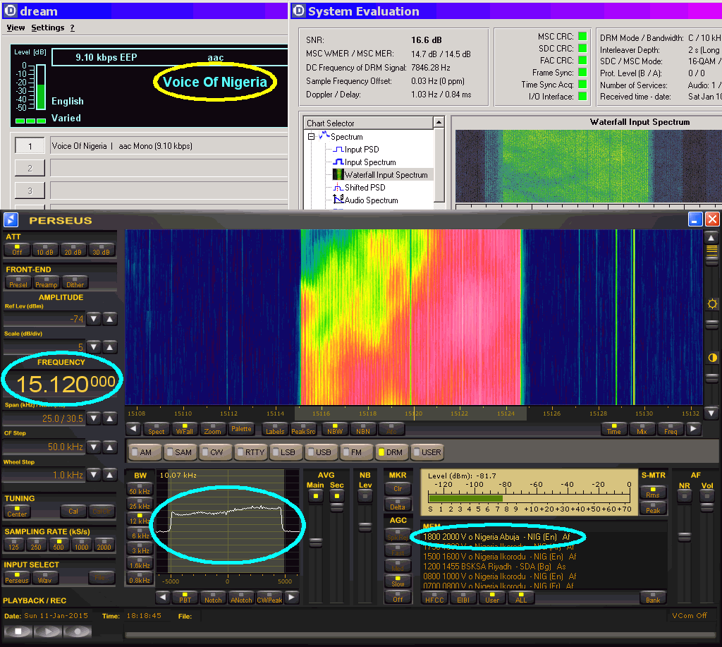 The frequency 15120 kHz gives you 5 entries among broadcast and utility radio stations. All these entries are perfectly scrollable. The ALL button, next to the User button, allows the display of all entries in the pertinent database, independent of the time of day, with entries at the actual reception time highlighted in bright yellow. The waterfall display here is 25 kHz wide and shows the wide PSK aggregate signal carrying the DRM broadcast of Voice of Nigeria, with "colourful" selective fading. Note also the typical rectangular DRM FFT spectrum in the filter display