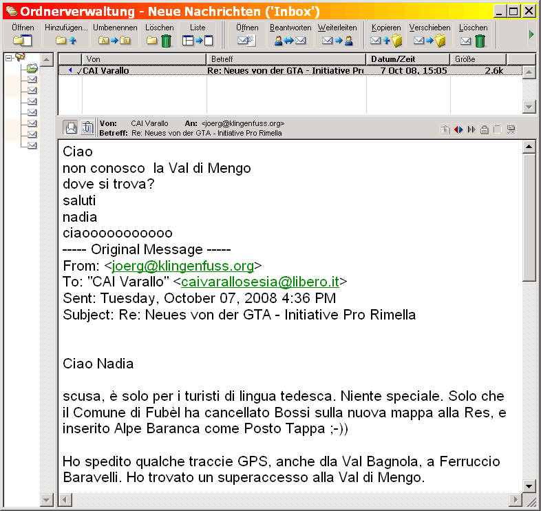 Wichtiger Hinweis: Sie können uns einfach via E-Mail anschreiben und/oder Bestellungen zuschicken. Wenn Sie von uns innerhalb einer vernünftigen Zeit, das heißt nach 48 Stunden, noch keine Antwort erhalten haben, dann haben wir Ihre Mitteilung nicht erhalten. Außerdem wird E-Mail nicht sofort beantwortet, während wir unterwegs sind, also öfters zwischen April und Oktober. Verwenden Sie unbedingt intelligente Texte als Betreff, beispielsweise Bestellung GTA-Wanderkarten oder Anfrage Rimella Bergwandern und nicht einfach Bestellung oder Anfrage, denn so etwas landet more often than not zusammen mit den "Viagras" im Spamfilter!