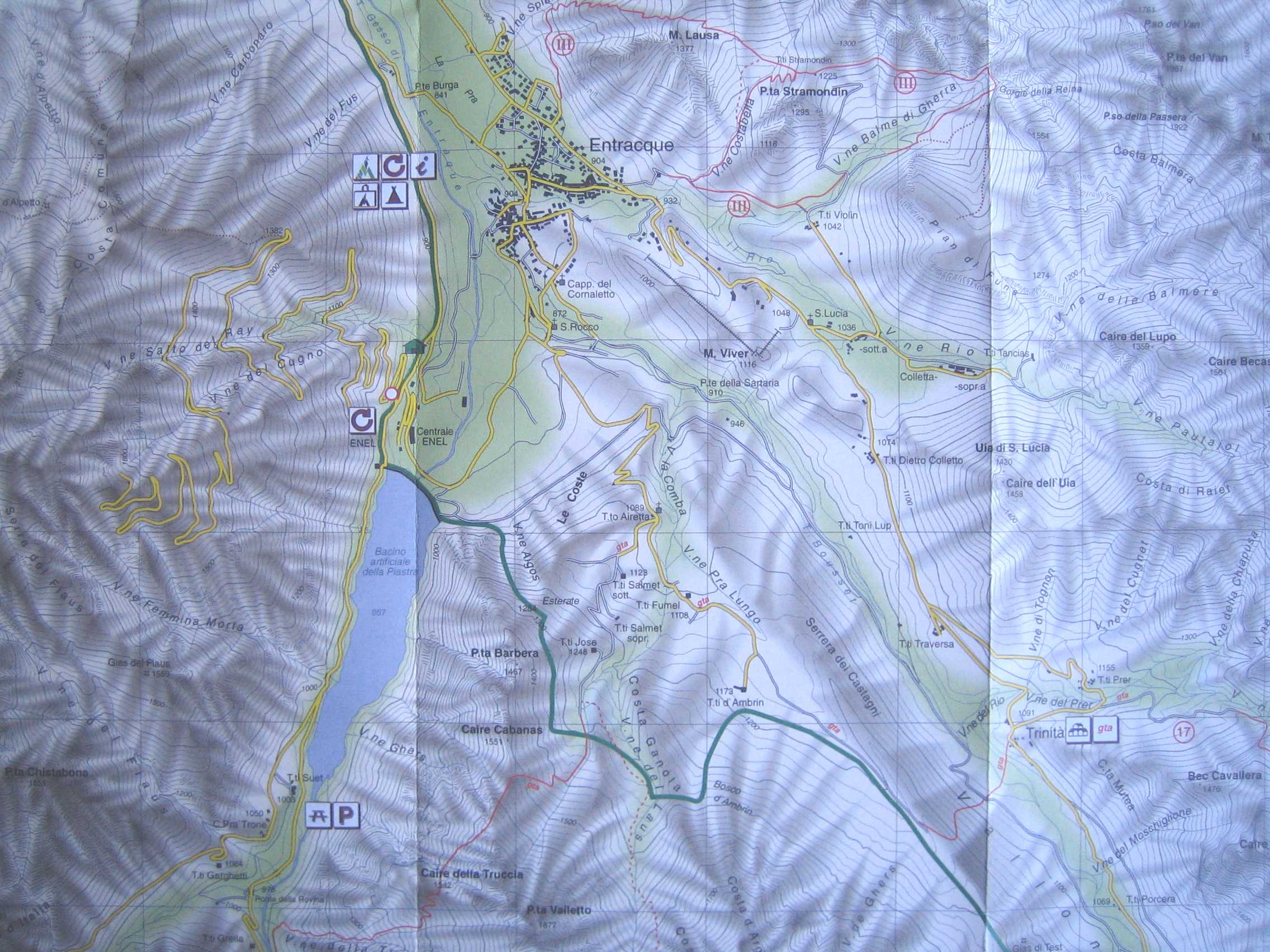 Drei topaktuelle Führer für die Bergwege in der Provinz Cuneo wurden 2007 erstellt. Sie können hier heruntergeladen werden. Digitale Wanderkarten dazu gibt es hier. Man begreift recht schnell, dass es sich hierbei um eine ganz nette - und stundenlange, wer die Zeit hat! - Spielerei auf dem PC oder Schlepptop handelt, die in der rauhen Wirklichkeit im Wildnisgebiet des Piemont eine professionell redigierte und gedruckte Wanderkarte auf Papier schon alleine wegen der Übersichtlichkeit, der Handlichkeit, der Präzision, dem vernachlässigbaren Gewicht und dem lächerlich niedrigen Preis niemals ersetzen wird: man drucke sich einmal eine 104 mal 77 Zentimeter große Karte wie das IGC-Blatt 8 Alpi Marittime e Liguri mit einem teuren Großformat-Tintenspritzer wischfest (!) in Bogenoffset-Qualität (!) und rechne sich realistisch die Kosten aus! Ebenso witzlos wäre das Einscannen und Übertragen als Rasterkarte in ein GPS-Gerät.