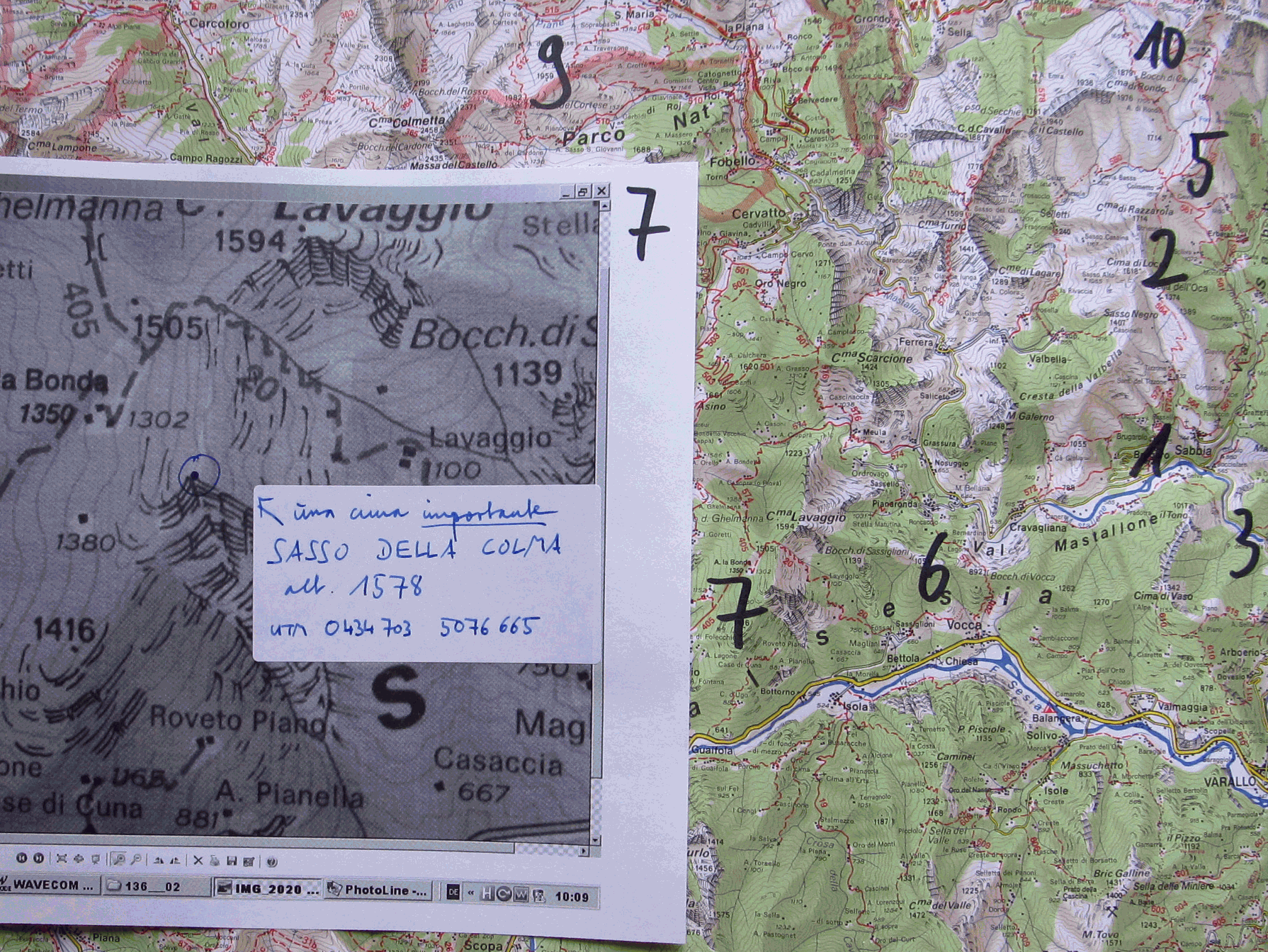 Carta Topografica d'Italia 1:25000, Istituto Geografico Militare. Präzise Karte, die jedoch nur durch ausgewiesene Wildnisspezialisten wie uns korrekt interpretiert werden kann. Die gelegentliche Berücksichtigung dieser traditionellen italienischen Militärkarte durch wirklich Ortskundige ist nur sinnvoll in intelligenter Kombination mit anderen perfekt evaluierten Quellen, insbesondere für unsere zukünftigen Projekte im Wildnisgebiet Rimella und Mastallonetal. Touristisch ist die Karte völlig unbrauchbar! Positiv: Sehr gutes topographisches Relief, gute Felsdarstellung, UTM-Gitternetz für GPS. Negativ: viele Ortsnamen sind grottenfalsch; Kosten mit Bankgebühren und Porto total weit über 20 EUR pro Sektion und somit extrem teuer; Lieferzeiten bestenfalls ½ bis 1 Jahr; praktisch sämtliche verlassenen Alpen wurden gelöscht und mit ihnen sämtliche auch noch vorhandenen Wege. Beispielsweise fehlt im obigen Ausschnitt aus dem Blatt 72 Sektion 3 Balmuccia in der Bildmitte der zentrale Übergang von der Alpe Cardone (Name fehlt) über den Sella Bassa dla Cuvàa (Name fehlt) zur Alpe Cuvàa (Name falsch), während ein völlig zugewachsener und unmöglicher Übergang westlich der Punta Castello eingezeichnet ist! Zwanzig Jahre nach dieser unserer realistischen Bewertung ist die im CAI/TCI-Gebietsführer identisch: "Anche se i rilievi risalgono agli anni '30, la rappresentazione del terreno è generalmente ancora attuale, mentre mancano diversi toponimi e altri sono errati. Parecchi alpeggi sono ridotti a ruderi e molti sentieri sono scomparsi. Evidentemente la rete stradale è assolutamente superata e anche le carte più recenti sono carenti e non sono state apportate le necessarie correzioni."
