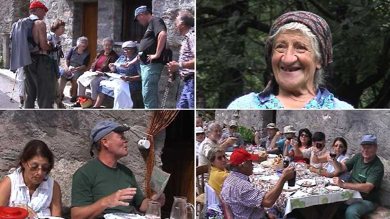 Giorgio hat den letzten Einwohnern von Cervatto schöne Fotos mitgebracht von den Alpen und den Bergen, wo sie ihre ganze Jugend verbracht haben und die jetzt im Alter für sie unerreichbar geworden sind --- Die alte Luigina aus San Gottardo erzählt --- Giorgio diskutiert mit Alda und Sergio auf der Alpe Baranca den nagelneuen Prospekt der Gemeinde Fobello --- Imbiß auf der Alpe Baranca