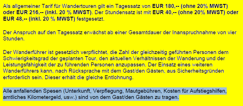In diesen Tarifen sind die Berufsaufwendungen des Begleiters enthalten, beispielsweise Bergausrüstung, Briefporto, Büromiete, Computer- Hard- und Software, Drucke, Haftpflicht-, Kranken-, Renten- und Unfallversicherung, Internet, Organisationsaufwand, Telefon, Urlaub, Weiterbildung und so weiter. Nicht enthalten sind bei kommerziellen Bergführern die erheblichen Kosten während der Tour selbst für Unterkunft, Verpflegung, Bergbahnen, PKW-Abschreibung, Kilometergeld, Mautgebühren, öffentliche Verkehrsmittel und so weiter. Diese Kosten kommen also jeweils noch dazu!