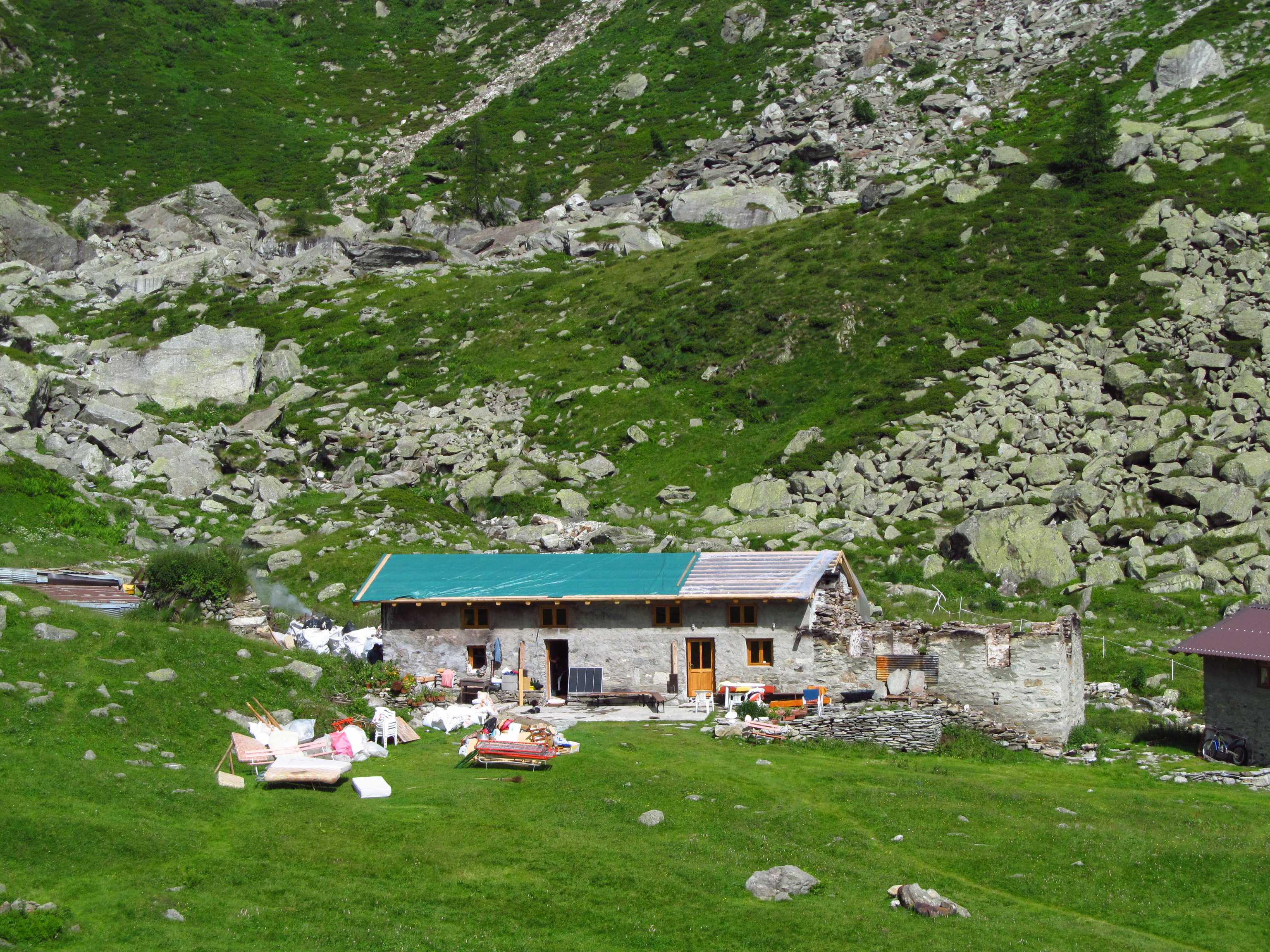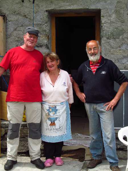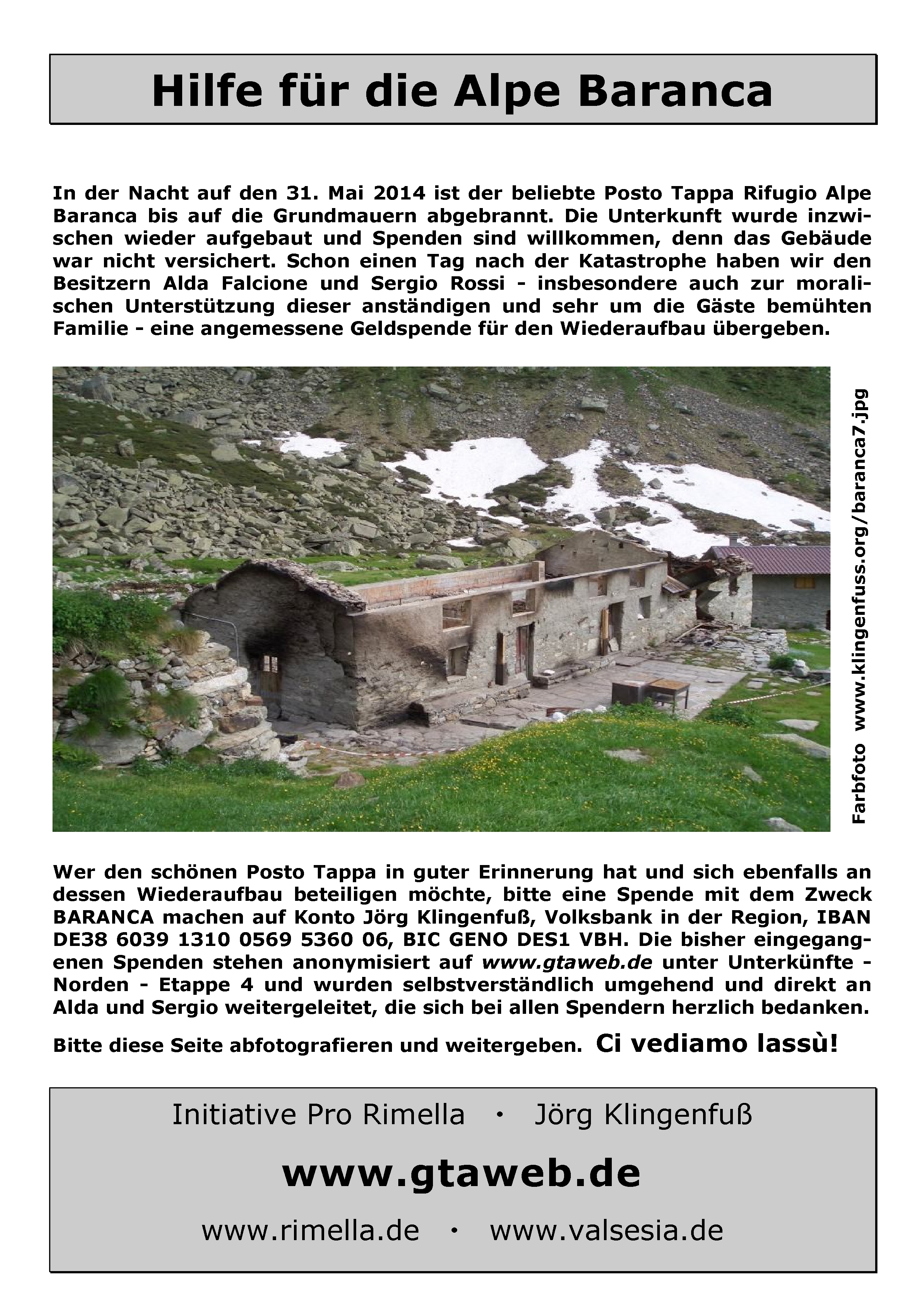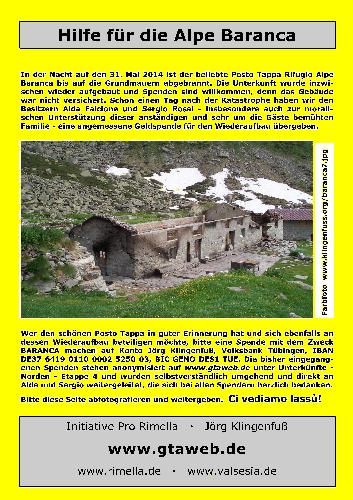 14. Juli 2014: Wir konnten Alda Falcione und ihrem Sohn Ivo heute abend den ersten Geldbetrag übergeben. Nach drei Wochen Schwerstarbeit mit der ganzen Familie und vielen Freunden und Helfern in 1600 Meter Höhe, teilweise bei Sauwetter und nachts ohne Heizung eisig kalt auf dem Boden schlafend (just for the record, die Lawine oben am See ist Mitte Juli immer noch vier Meter hoch!!!), freuen sie sich auf die GTA-Gäste. - 25. Juli 2014: Wir waren heute mit einer Wandergruppe auf der Alpe und haben dort zu Mittag gegessen, gut wie immer. In nur 5 Wochen haben sie auf Baranca Unglaubliches geleistet. Alleine für das tonnenschwere Baumaterial waren bislang 35 Hubschrauberflüge à 4 Minuten rauf-runter ex Campo di Fobello nötig, zum Stundensatz von 3000+ EUR: Arbeitsgeräte, Befestigungstechnik, Blechpatscherei, Dachplatten, Dämmmmmmaterial, Farbkübel, Fenster, Gips, Holzboden, Keramikplatten, Klebstoffe, Rohre, Tragwerk, Treppen, Türen, Zement. Hinzu kommen die Kosten für das eigentliche Material und dann erst noch die gesamte komplexe Inneneinrichtung wie Betten, Decken, Dusche, Gasflaschen, Generator, Geschirr, Kabel, Küchenherd, Leintücher, Leuchten, Matratzen, Schränke, Stühle, Tische, Toiletten und Waschmaschine, und später speditiv zig Zentner Lebensmittel für die GTA-Wanderer! Die offizielle Wiedereröffnung fand am 3. August statt. Küche und Eßraum und Schlafraum sind nagelneu, Dusche und Toilette ebenfalls, es ist aber noch längst nicht alles fertig und perfekt. Zum Glück gab es auch zahlreiche spontane Sachspenden für den allerdringendsten Erstbedarf; beispielsweise hat Renata Rinoldi vom Posto Tappa GTA Albergo Fontana in Rimella ihr praktisch nagelneues "Hochzeitsgeschirr" hergegeben sowie einige unbenützte Decken und Leintücher. - 11. September 2014: Sehr gutes Mittagessen mit einer Wandergruppe auf Baranca. Gleichzeitig konnten wir den zweiten Geldbetrag übergeben, und Alda mit Familie bedankt sich herzlich bei allen, die helfen. Die Unterkunft ist bis 30. September geöffnet und alle hoffen auf ein gutes Jahr 2015. Auch kleine Spenden sind nach wie vor willkommen und werden insbesondere auch im Winterhalbjahr, wo noch zahlreiche offene Rechnungen zu bezahlen sind, gewohnt speditiv weitergeleitet, denn wir halten das ganze Jahr über engen Kontakt mit den Freunden im Sesiatal! - 16. Januar 2015: Alda bedankt sich bei einem langen Telefongespräch nochmals für alle Spenden und beabsichtigt - falls nicht zuviel Schnee liegt - heuer bereits am 1. Juni zu öffnen. - Sommer 2015: Auf 1600 Meter Höhe schläft es sich besser als in der Höllenhitze im Tiefland. Mit unseren Rimella-Wandergruppen genießen wir beim Abstieg vom Lago di Baranca das bereits legendäre "kleine Vesper" auf Baranca. Alda und Sergio freuen sich weiter über jede, auch kleine, Spende.