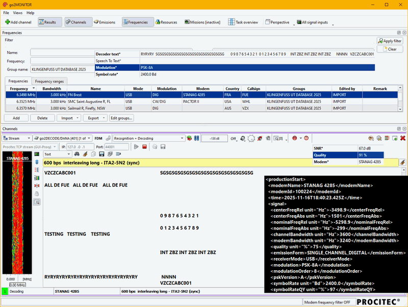 Now let's zoom on a typical PSK aggregate signal of station FUG on 8454.8 kHz, and decode STANAG 4285 by means of amateur decoding freeware SIGMIRA. The waterfall display here is 12 kHz wide and shows the complex aggregate and signal propagation fading in full detail. Note also the typical rectangular PSK FFT spectrum in the filter display. Below is a similar transmission decoded with a professional PROCITEC go2MONITOR system. Click to enlarge!