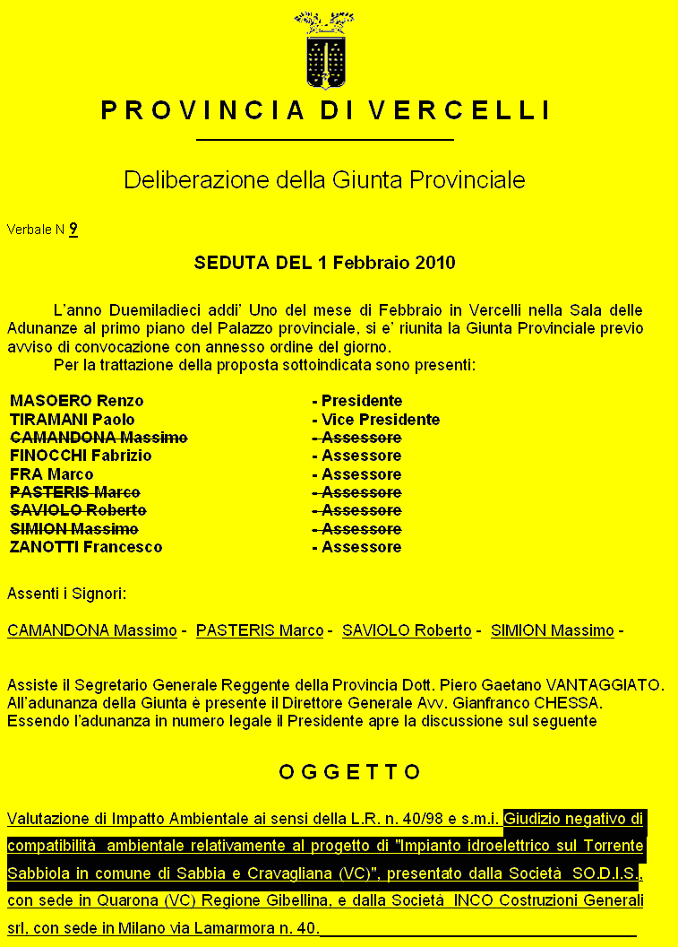 - Consiglio della Unione Montana Valsesia, seduta del 28 maggio 2004: "Ordine del Giorno. Espressione contrarietà alla realizzazione del nuovo invaso sul Torrente Mastallone."