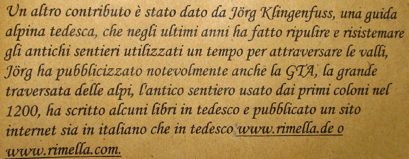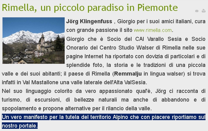 "Dalla Germania sui sentieri dei Walser di Rimella. Grazie ad un trekker di Tubinga il paese diventa famoso Oltroalpe. Rimella, piccolo paese di lingua Walser, piace ai turisti tedeschi: da qualche anno è infatti meta di escursioni per molti trekker germanici. Buona parte del merito di tanta fama Oltroalpe si deve a Jörg Klingenfuss, promotore a Tubinga della realtà rimellese. Da almeno due anno infatti, grazie anche ai siti www.rimella.de e www.valsesia.de (in tedesco e in italiano), Klingenfuss porta in valle gruppi di escursionisti dalla Germania; così anche per l'estate 2005 sono previsti diversi itinerari sul GTA e in val Mastallone. Sempre sui siti Internet vengono segnalate le possibilità di alloggio e una seria di informazioni utili, non solo ai turisti tedeschi. 'Jörg Klingenfuss è una guida turistica che ha preso a ben volere la nostra valle - dice Pier Giorgio Vasina, assessore alla cultura di Rimella - e che ripercorre gli itinerari che in parte abbiamo recuperato noi, come comune.' Soddisfatti ovviamente gli amministratori rimellesi per l'iniziativa tedesca: 'I turisti tedeschi sono contenti per l'ospitalità, la natura, il cibo e tornano volentieri.' " Notizia Oggi, 10 Gennaio 2005.