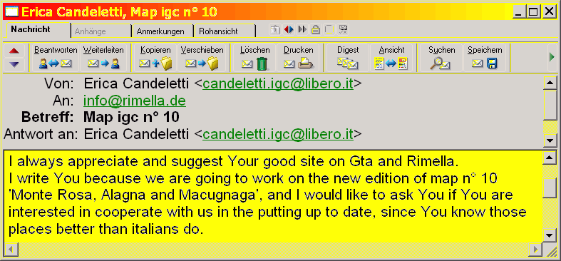 "Devo poi farLe i complimenti per la Sua attività in Val Mastallone: le mie origini (i nonni e mio papà) sono di Fobello, mio padre andava con i genitori all'alpe a Oro Negro, e mio nonno ha gestito l'Albergo della Posta a Fobello durante la 2a Guerra Mondiale. Per tutto questo, sono molto affezionato alla Val Mastallone, e sapere che questa piccola e dimenticata valle viene apprezzata anche nella lontana Germania mi riempie di gioia." Marco Maffeis, Varallo, collaborotore per la parte Valsesiana della futura Guida Alpi Biellesi e Valsesiane del CAI/TCI, 20 Novembre 2005.