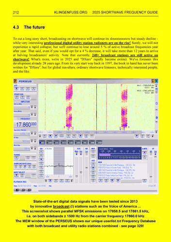 Fascinating screenshots of the PERSEUS Software-Defined Receiver (SDR) applied for the reception of professional utility radio stations are included. Our brandnew 2025 Frequency Database for the Perseus LF-HF Software-Defined Receiver now covers 12'876 up-to-date broadcast and utility radio station HF frequencies - all in one file combined!
