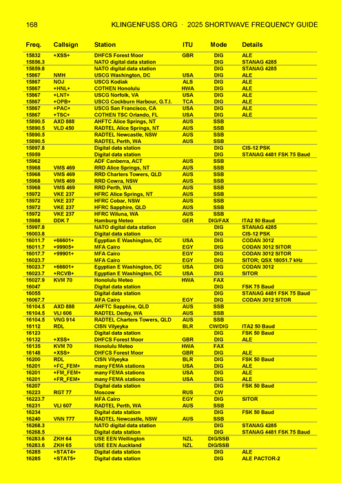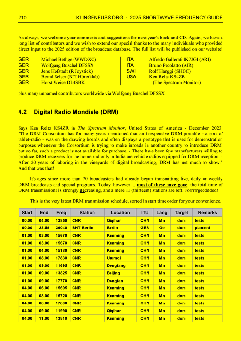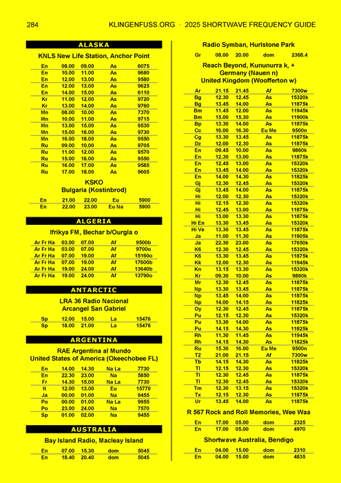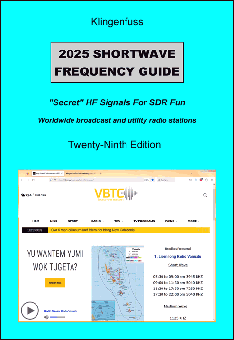 The 2025 Shortwave Frequency Guide covers very latest technical developments by really innovative broadcast (!) stations such as Shortwave Radiogram's test of state-of-the-art digital data signals for the transmission of text and graphic files. Click the graphics for download!